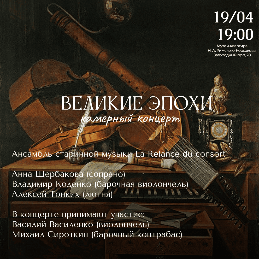 Позвольте себе роскошь погрузиться в многовековую историю камерной музыки и ощутить её непреходящую красоту в исполнении Ансамбля старинной музыки «La Relance du consort». Необычные барочные инструменты можно рассмотреть вблизи и насладиться необычным их звучанием тет-а-тет.
