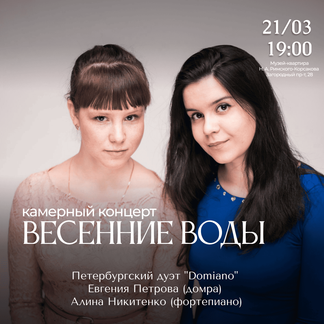 Известный петербургский дуэт «Domiano» — Евгения Петрова (домра) и Алина Никитенко (фортепиано) — представляют новую программу, почти целиком посвященную сочинениям двух русских гениев П. Чайковского и С. Рахманинова. Знаменитые романсы и инструментальные пьесы этих известных на весь мир композиторов будут по-новому раскрыты в переложении для домры и фортепиано. Кроме знаменитых шедевров на концерте вы сможете познакомиться с творчеством современных композиторов — члена Союза композиторов Росси Алины Никитенко и Владимира Кошелева.