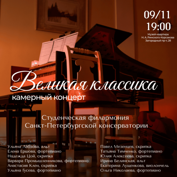 Не упустите возможность прикоснуться к прекрасному и открыть для себя новые грани классической музыки в исполнении талантливых студентов Санкт-Петербургской государственной консерватории им. Н.А. Римского-Корсакова.