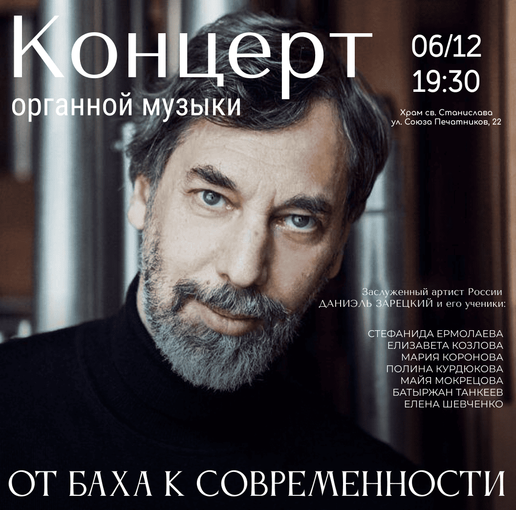 Заслуженный артист России Даниэль Зарецкий – известный петербургский органист, концертирующий по всей стране и за рубежом. Его ученики – талантливые воспитанники кафедры органа и клавесина Санкт-Петербургской консерватории имени Н.А. Римского-Корсакова и факультета искусств Санкт-Петербургского университета.