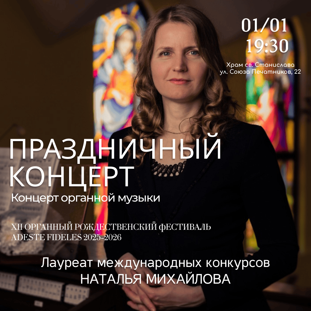 «Органные вечера в Старой Коломне» — это захватывающее путешествие в мир органной музыки с лучшими органистами Санкт-Петербурга и России! Приглашаем петербуржцев и гостей города на «Праздничный концерт» Натальи Михайловой, который пройдет в Римско-католическом храме св. Станислава 1 января в 19:30 в рамках XII Рождественского фестиваля ADESTE FIDELES.