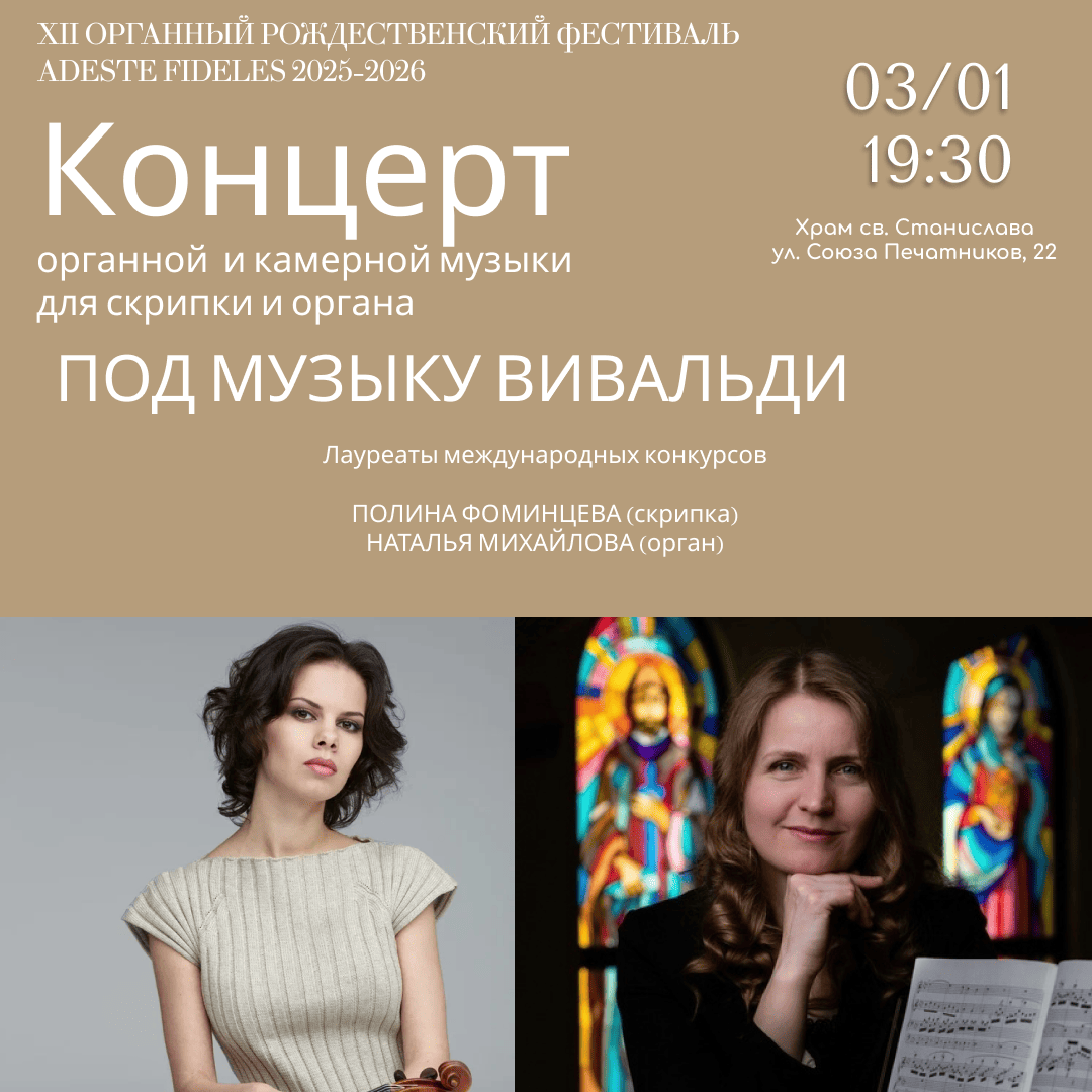 «Органные вечера в Старой Коломне» — это захватывающее путешествие в мир органной музыки с лучшими органистами Санкт-Петербурга и России! Приглашаем петербуржцев и гостей города на концерт Натальи Михайловой (орган) и Полины Фоминцевой (скрипка) «Под музыку Вивальди», который пройдет в Римско-католическом храме св. Станислава 3 января в 19:30 в рамках XII Рождественского фестиваля ADESTE FIDELES.