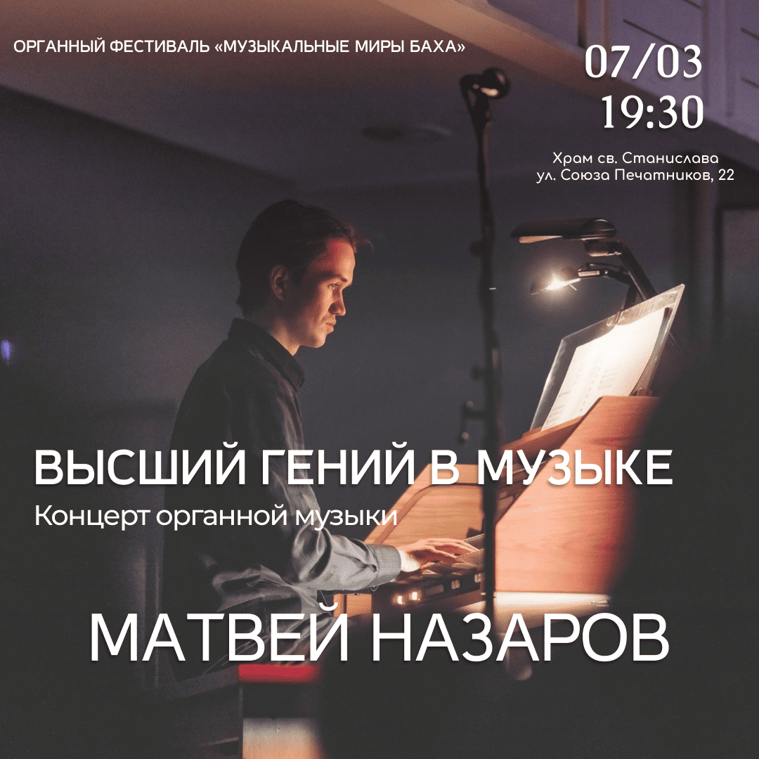 «Органные вечера в Старой Коломне» — это захватывающее путешествие в мир органной музыки с лучшими органистами Санкт-Петербурга и России! Приглашаем петербуржцев и гостей города на концерт Матвея Назарова «Высший гений в музыке», который пройдет в Римско-катoлическом храме св. Станислава 7 марта в 19:30 в рамках фестиваля «Музыкальные миры Баха».