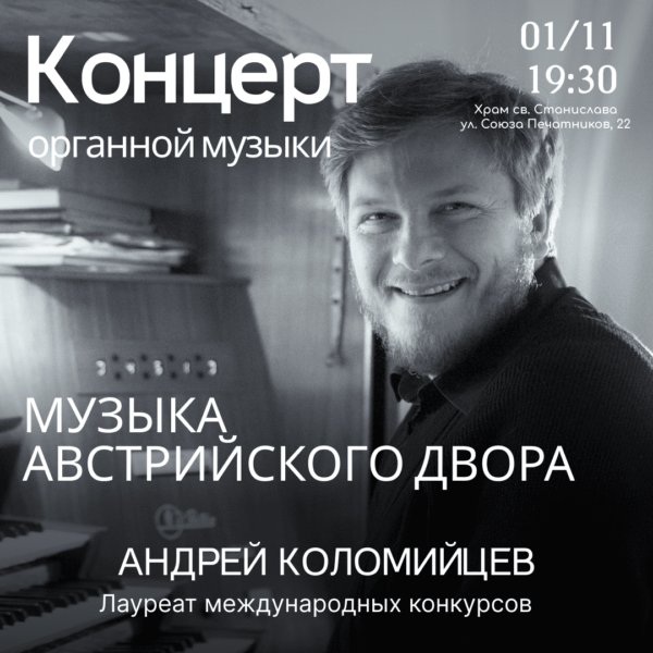 «Органные вечера в Старой Коломне» — это захватывающее путешествие в мир органной музыки с лучшими органистами Санкт-Петербурга и России! Приглашаем петербуржцев и гостей города на концерт Андрея Коломийцева «Музыка австрийского двора», который пройдет в Римско-католическом храме св. Станислава 1 ноября в 19:30.