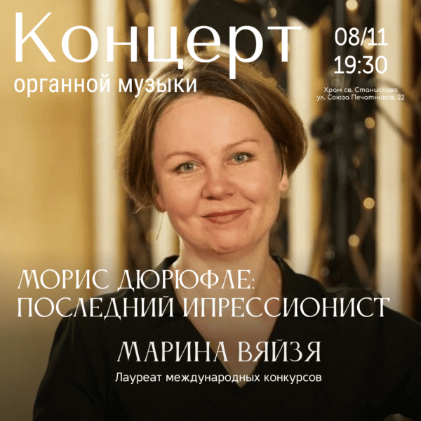 «Органные вечера в Старой Коломне» — это захватывающее путешествие в мир органной музыки с известными органистами Санкт-Петербурга и всей России! Приглашаем жителей и гостей города на органный концерт Марины Вяйзя «Морис Дюрюфле: последний романтик», который пройдет в Римско-католическом храме св. Станислава 8 ноября в 19.30.