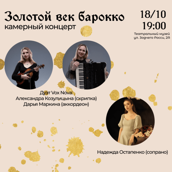 Блестящий ансамбль профессиональных музыкантов представит эти шедевры в их первозданной красоте. Каждый исполнитель — признанный мастер своего дела, способный передать всю глубину и эмоциональную насыщенность барочной музыки.